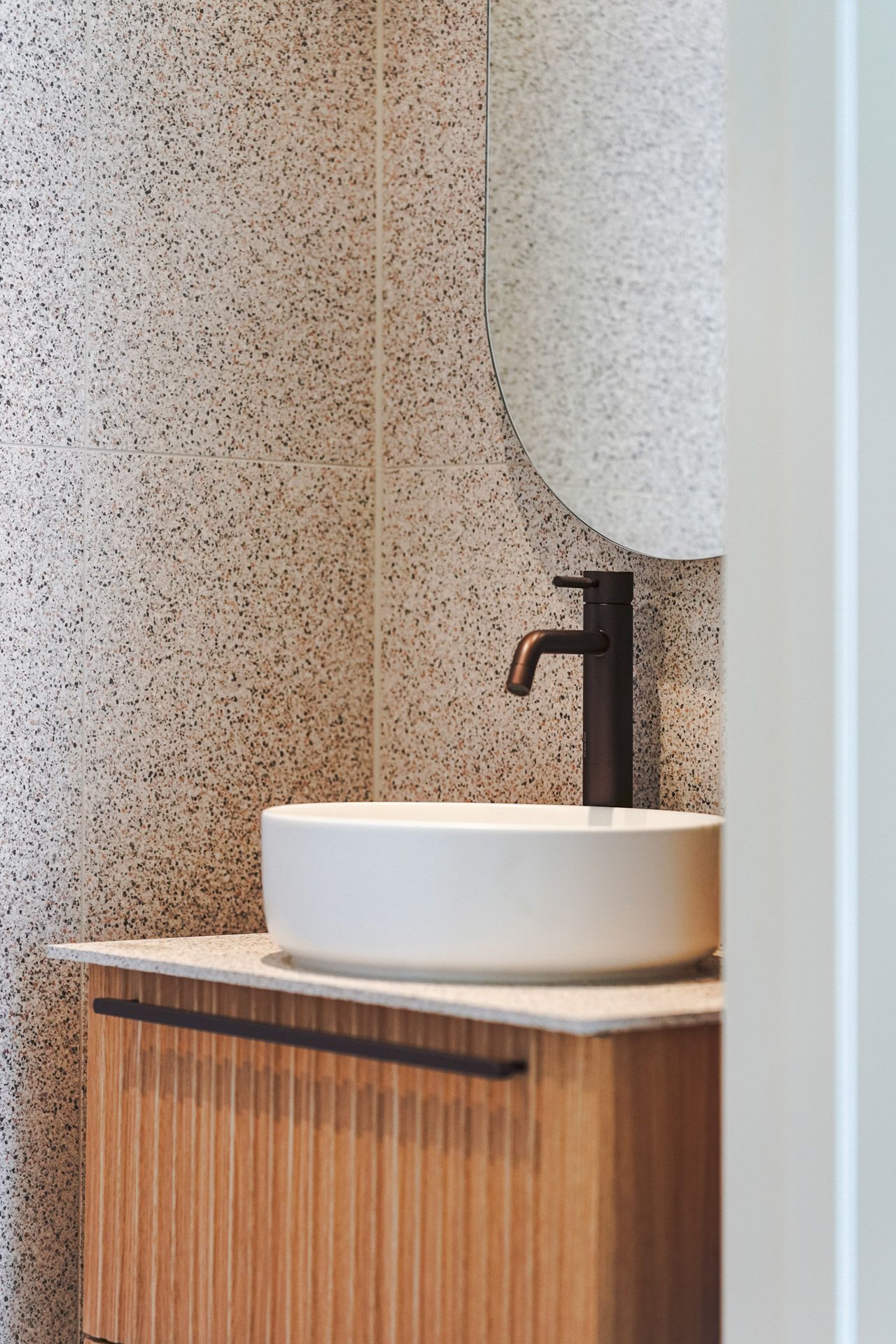 Moderne bad med store fliser, innbygd armatur og servantløsning som kombinerer eleganse og funksjonalitet.